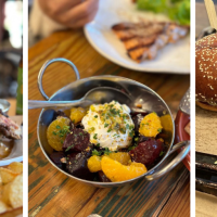 Wood fire grilled salmon, crisp chopped romaine, grilled hearts of palm, black pepper, Parmesan, vegan caesar dressing.
